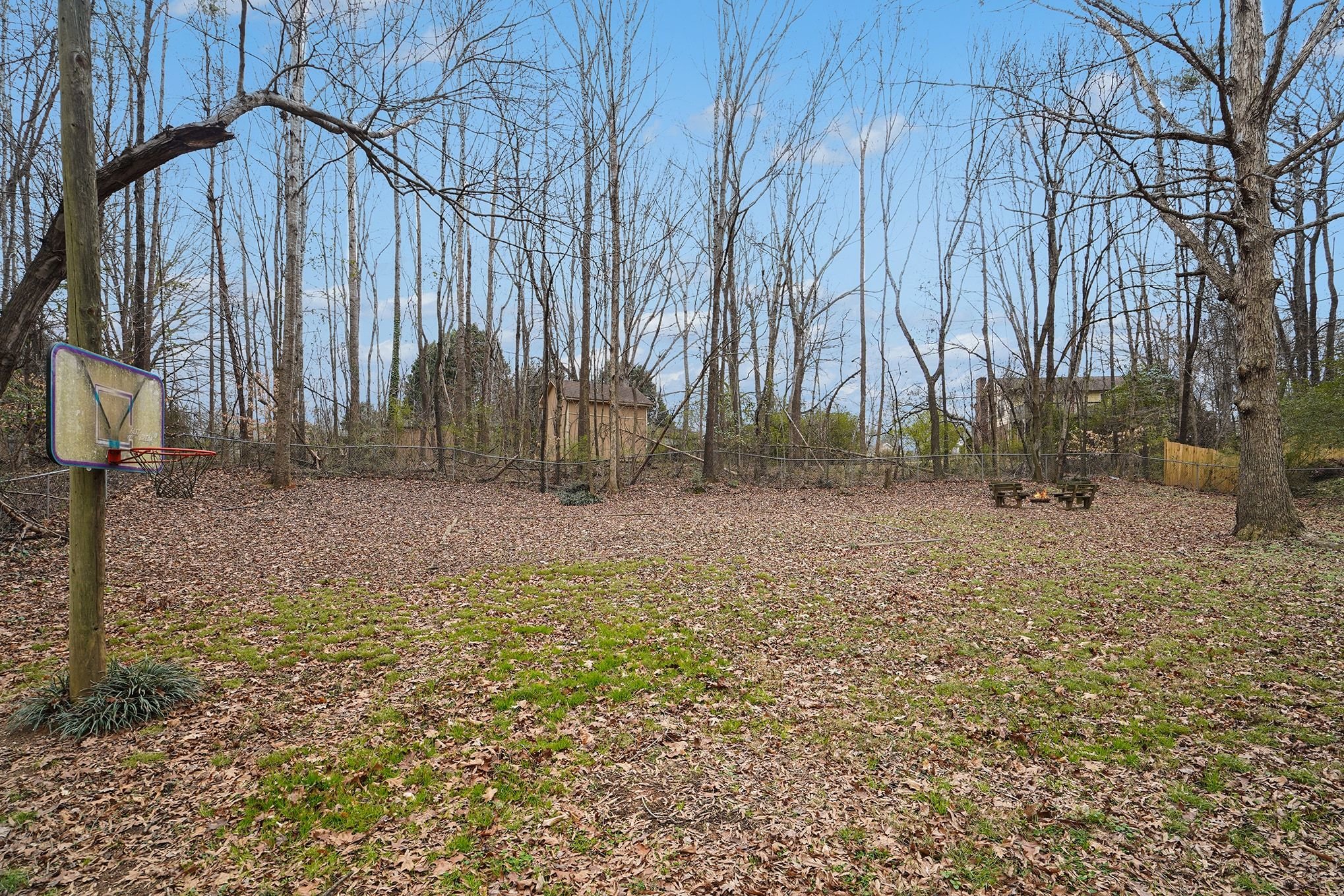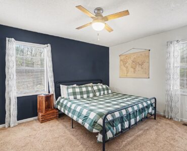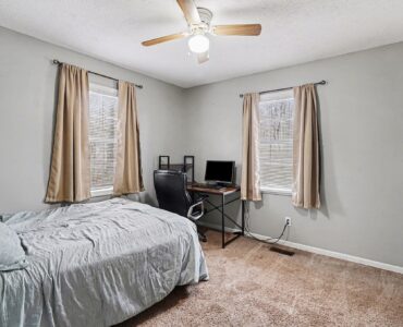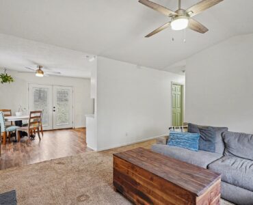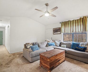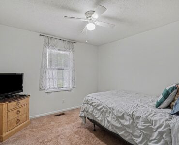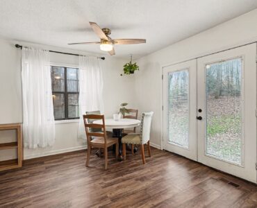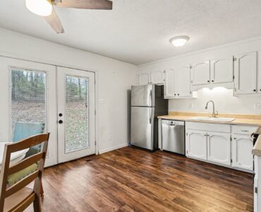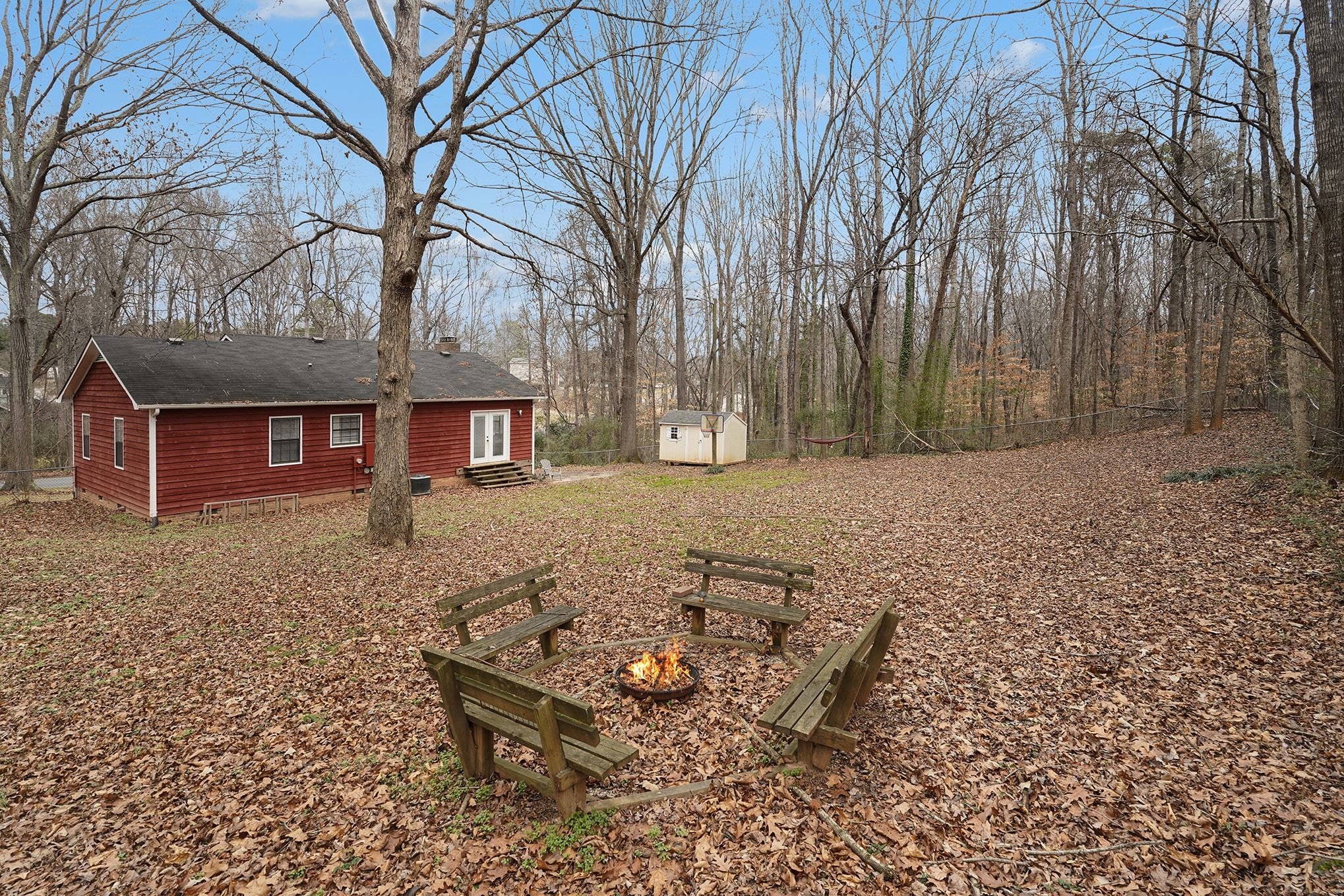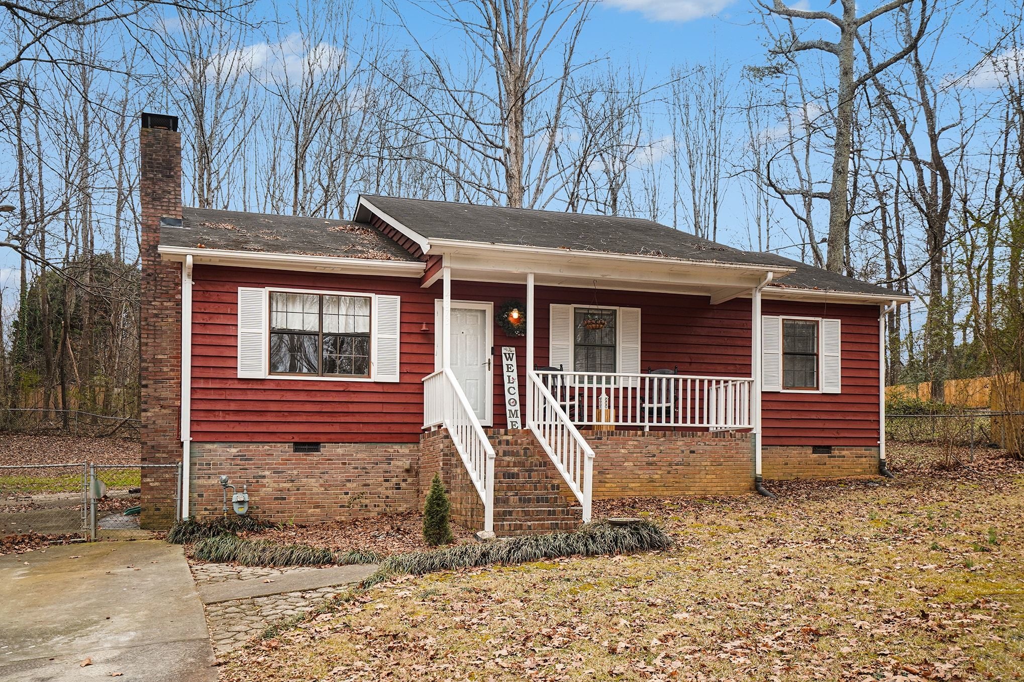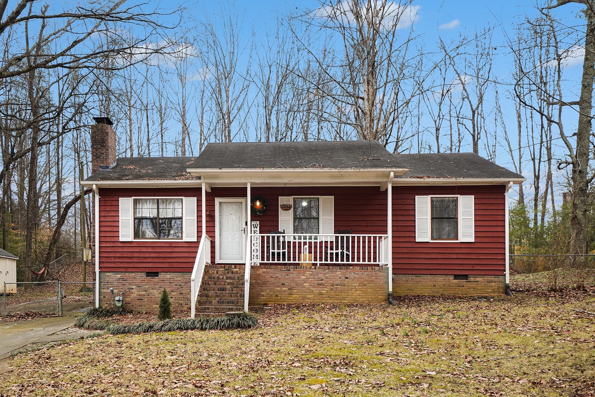 Rustic Red Ranch on a private lot with no neighbors beside or across. This 3-bedroom, 2-bath home features a welcoming rocking chair front porch, a large fenced backyard with firepit area and outbuilding for storage. Cozy living room offers a brick hearth fireplace, vaulted ceiling, and ceiling fan, open to the kitchen dining area. Kitchen includes stainless steel appliances, dining space, and French doors leading to the backyard. All bedrooms offer good space and ceiling fans. Primary bedroom features two closets, including a walk-in. Primary bath includes tile flooring, vanity, and unique wood trimmed shower. Additional highlights include an encapsulated crawlspace and exterior paint completed in 2024. Convenient to shopping, restaurants, and schools. Charming home ready for new owners! Great Value – no HOA!