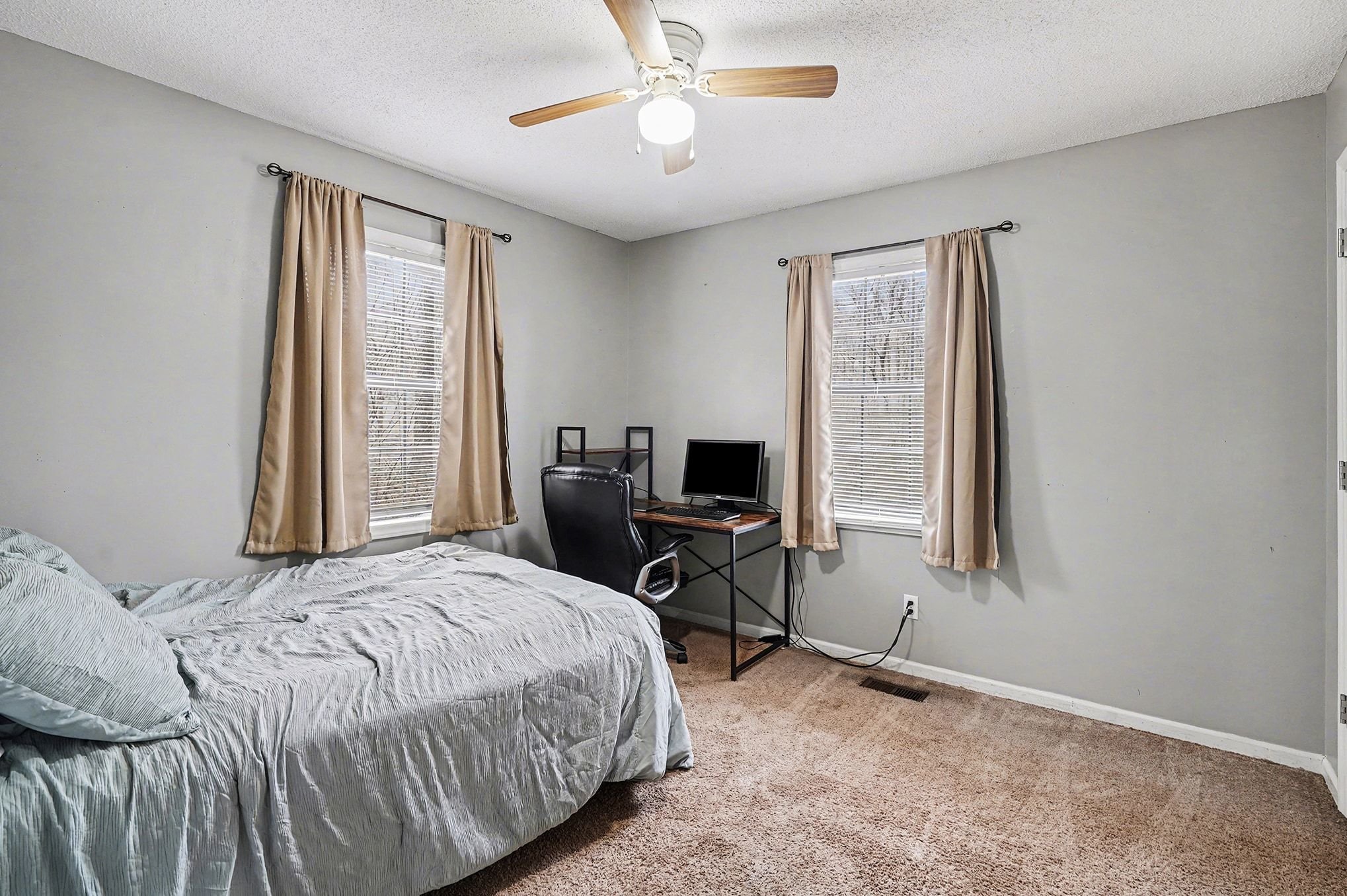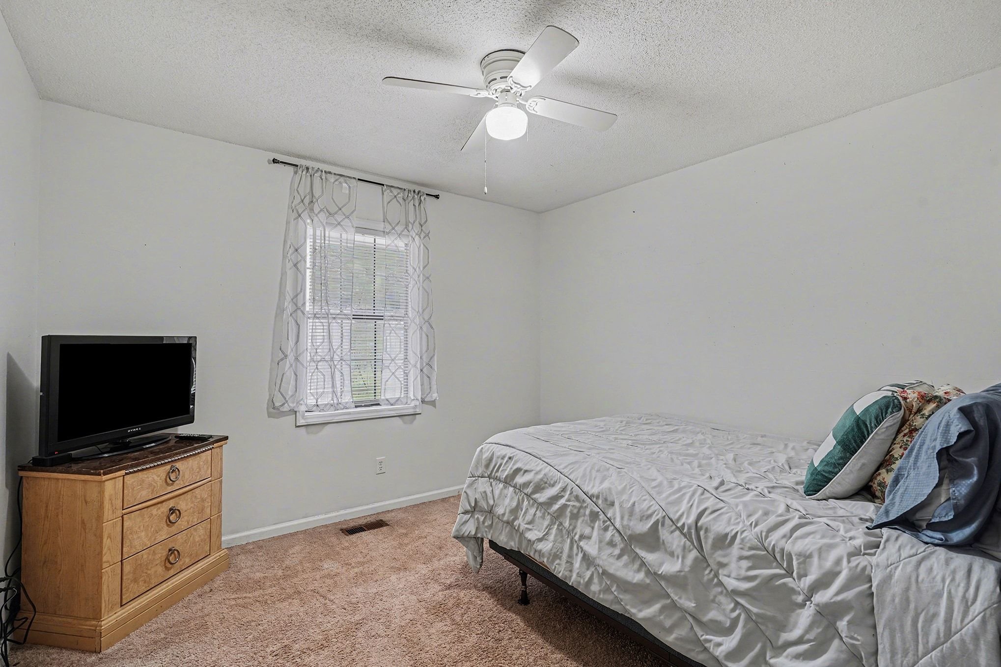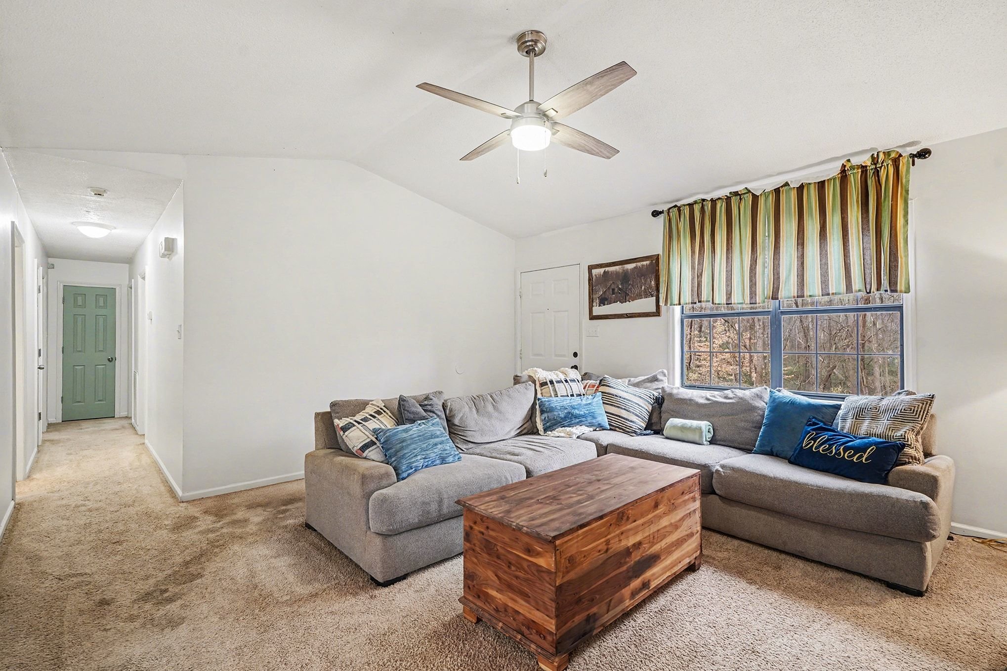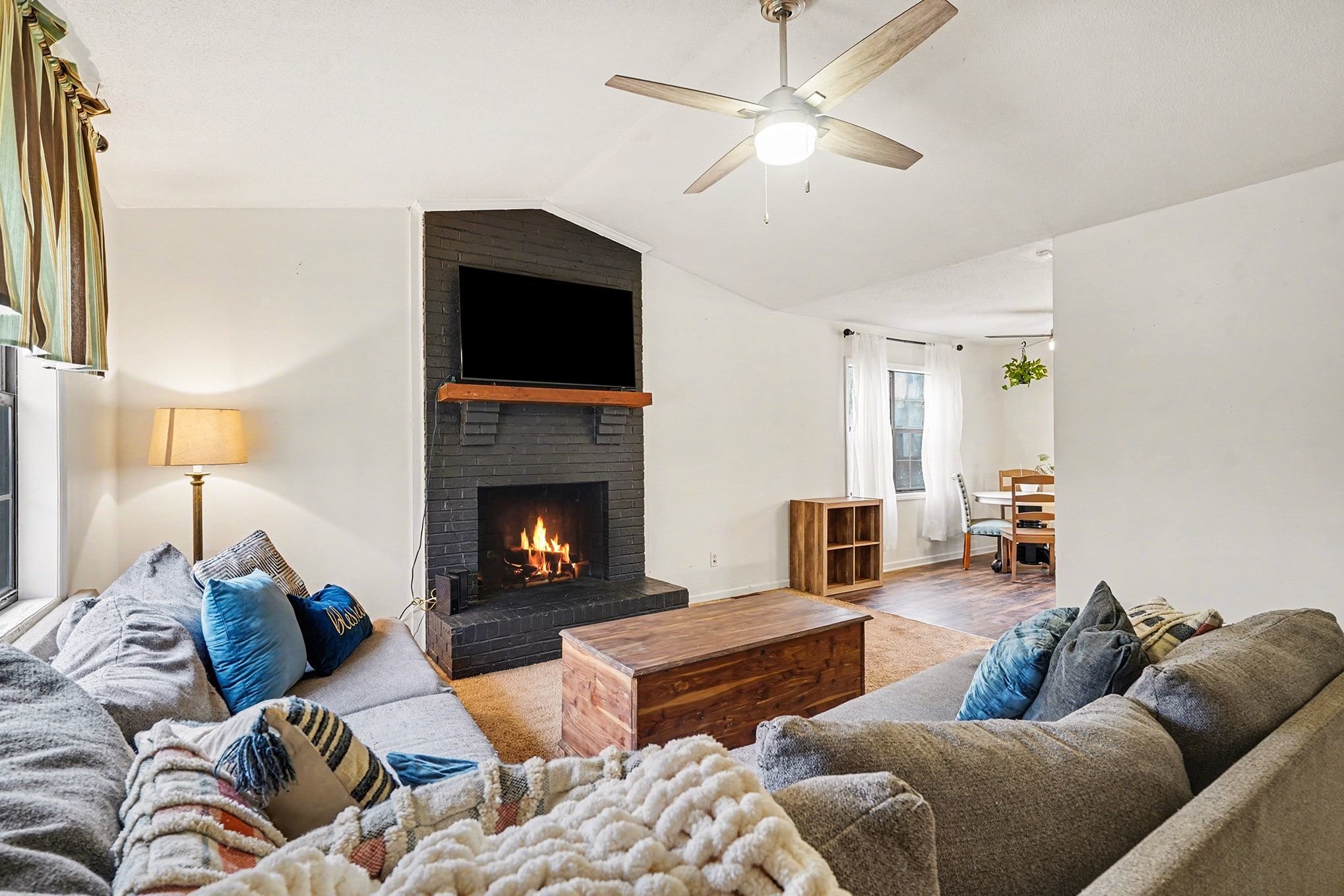 Rustic Red Ranch on a private lot with no neighbors beside or across. This 3-bedroom, 2-bath home features a welcoming rocking chair front porch, a large fenced backyard with firepit area and outbuilding for storage. Cozy living room offers a brick hearth fireplace, vaulted ceiling, and ceiling fan, open to the kitchen dining area. Kitchen includes stainless steel appliances, dining space, and French doors leading to the backyard. All bedrooms offer good space and ceiling fans. Primary bedroom features two closets, including a walk-in. Primary bath includes tile flooring, vanity, and unique wood trimmed shower. Additional highlights include an encapsulated crawlspace and exterior paint completed in 2024. Convenient to shopping, restaurants, and schools. Charming home ready for new owners! Great Value – no HOA!