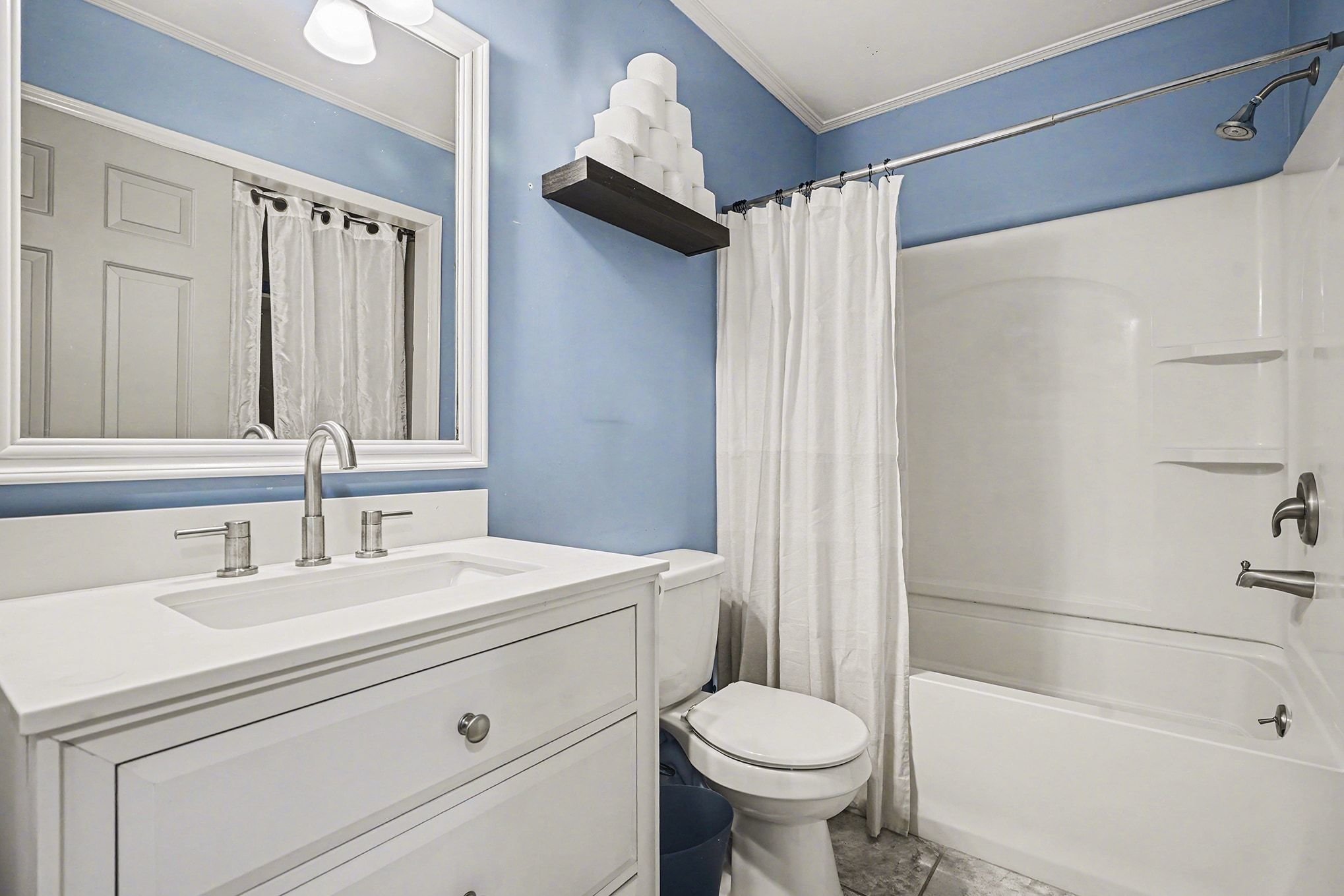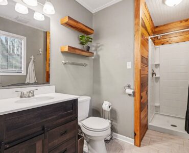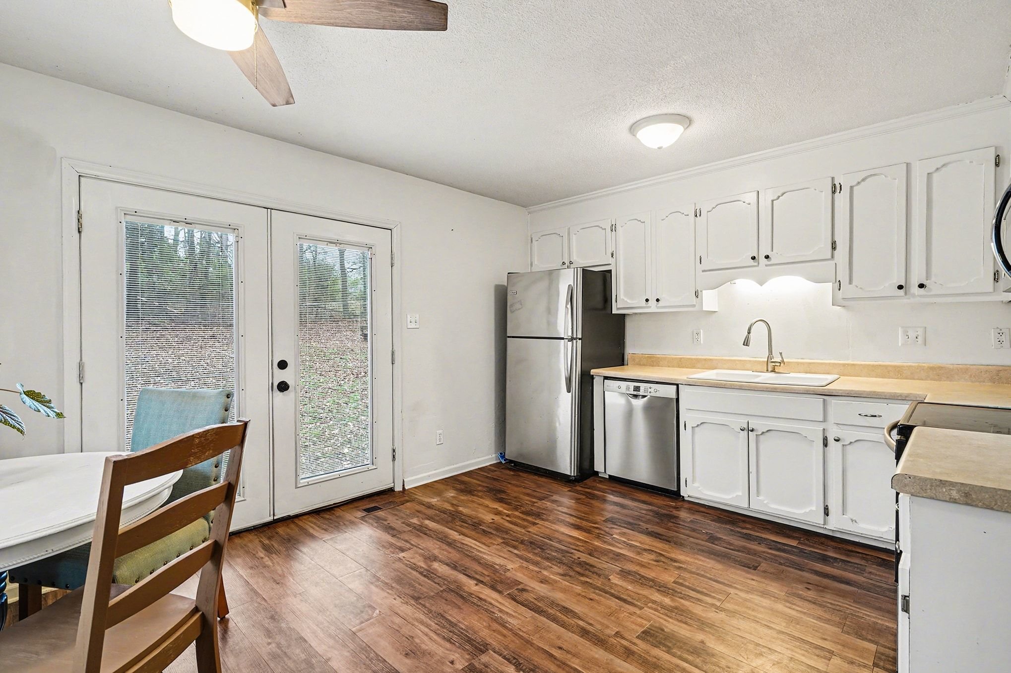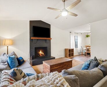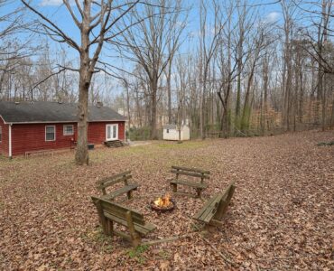 Rustic Red Ranch on a private lot with no neighbors beside or across. This 3-bedroom, 2-bath home features a welcoming rocking chair front porch, a large fenced backyard with firepit area and outbuilding for storage. Cozy living room offers a brick hearth fireplace, vaulted ceiling, and ceiling fan, open to the kitchen dining area. Kitchen includes stainless steel appliances, dining space, and French doors leading to the backyard. All bedrooms offer good space and ceiling fans. Primary bedroom features two closets, including a walk-in. Primary bath includes tile flooring, vanity, and unique wood trimmed shower. Additional highlights include an encapsulated crawlspace and exterior paint completed in 2024. Convenient to shopping, restaurants, and schools. Charming home ready for new owners! Great Value – no HOA!